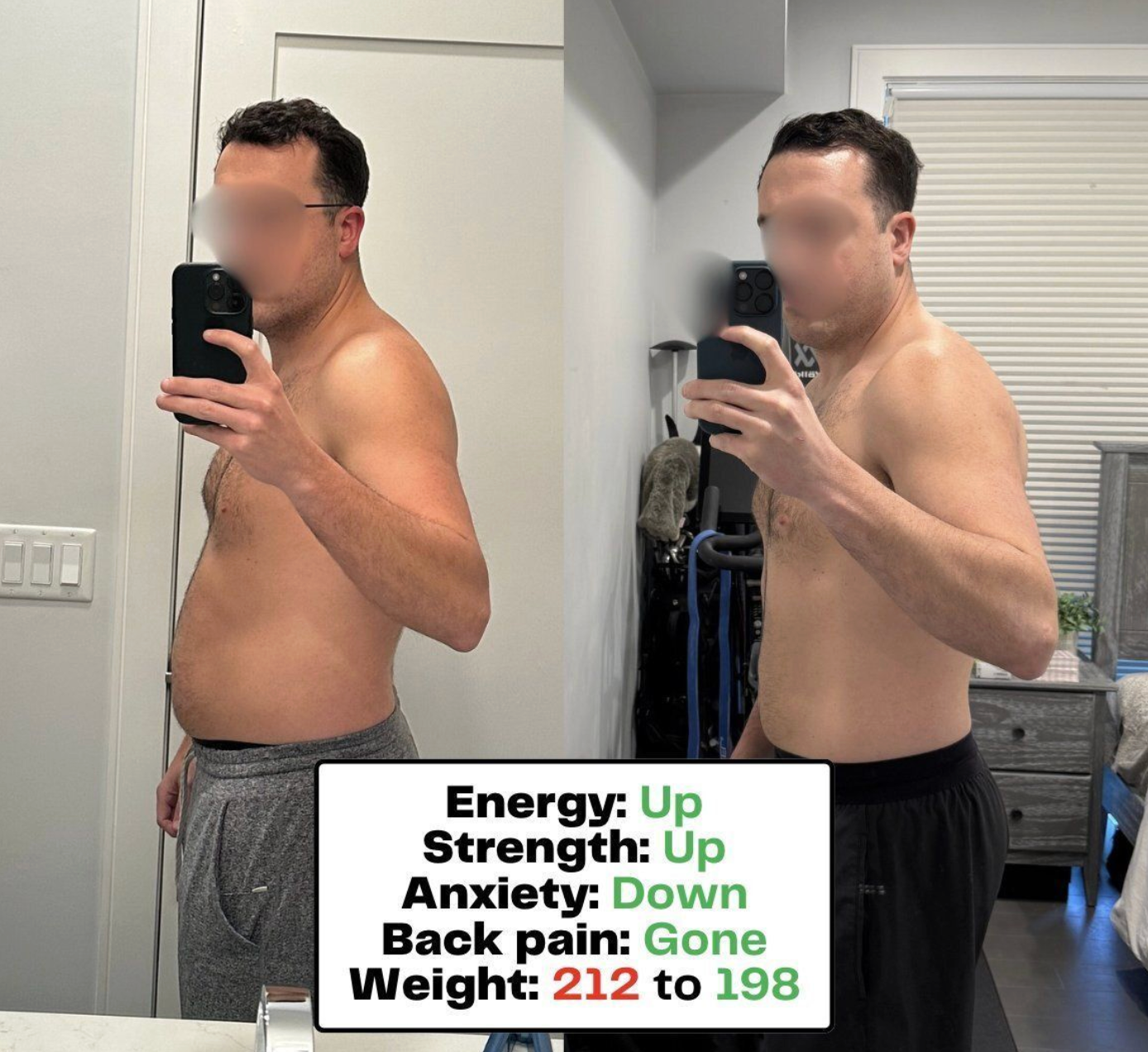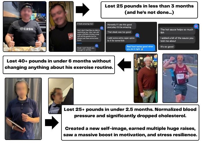 - Personal Transformation: -50 lbs fat, +20 lbs muscle after 5 surgeries and decades of inflammation