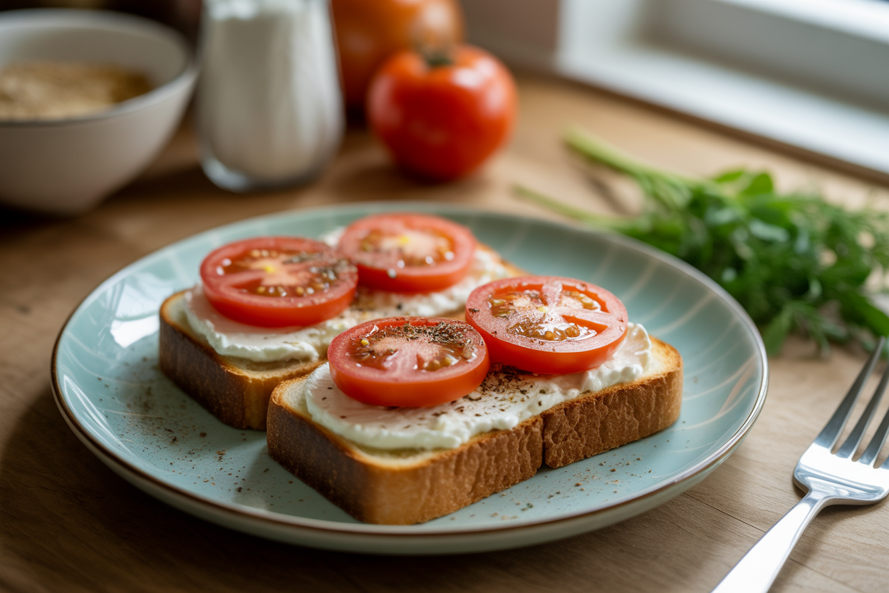 Toast the bread, spread or spoon the cottage cheese on top, then add tomatoes, seasoning, and a light drizzle of olive oil. Serve it right away while the toast still has some crunch.