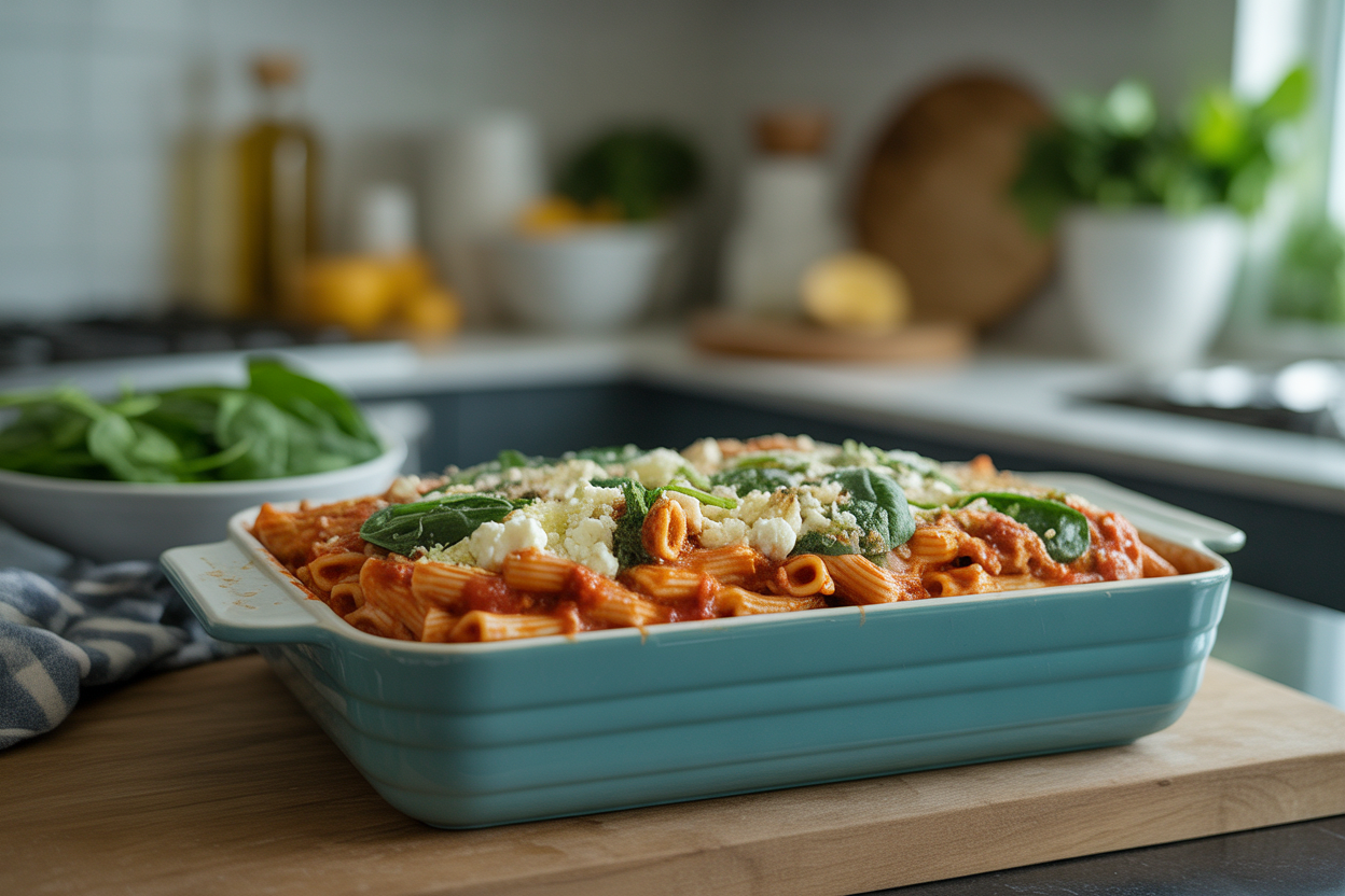 Cook the pasta until just al dente. While it cooks, brown the turkey in a large oven-safe skillet or baking dish if you want fewer dishes. Stir in marinara, spinach, garlic powder, Italian seasoning, salt, and pepper. Fold in the cooked pasta and cottage cheese, then top with mozzarella. Bake at 400°F for about 15 minutes until hot and bubbly.