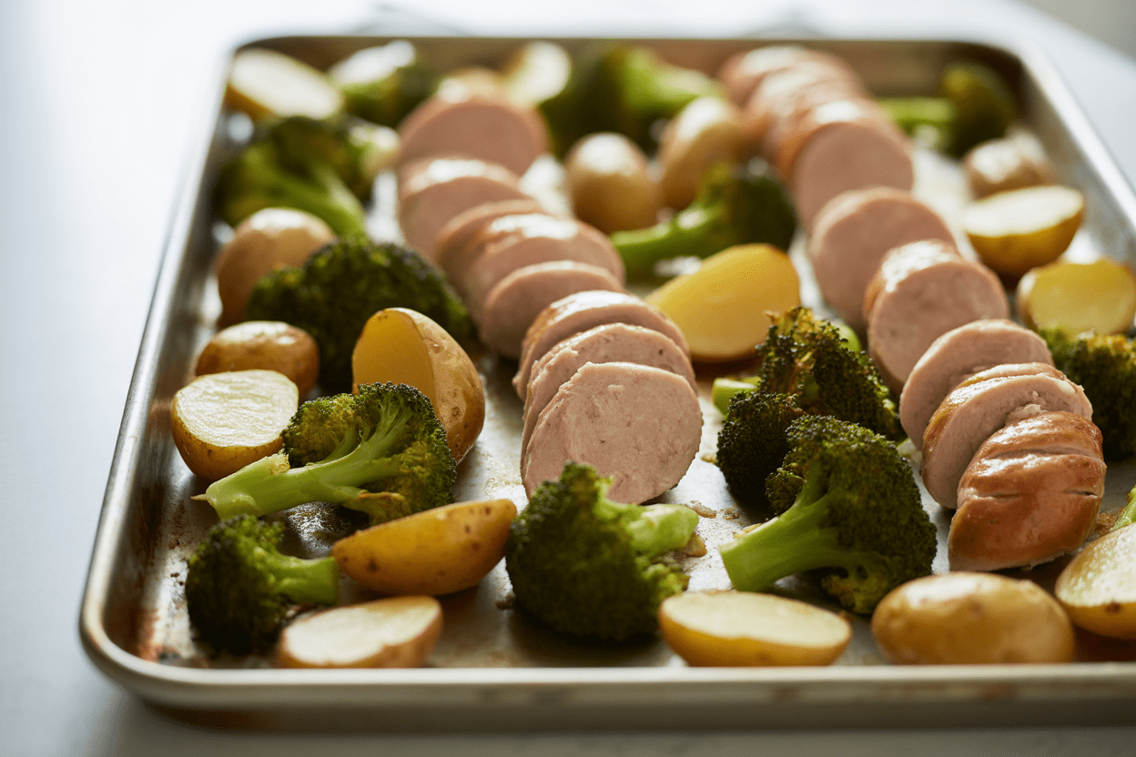 Toss the potatoes with olive oil and seasoning and spread them on a sheet pan. Roast for about 15 minutes at 425°F. Add the sliced chicken sausage and broccoli, toss everything together, and roast another 12 to 15 minutes until the potatoes are tender and the broccoli is browned on the edges.