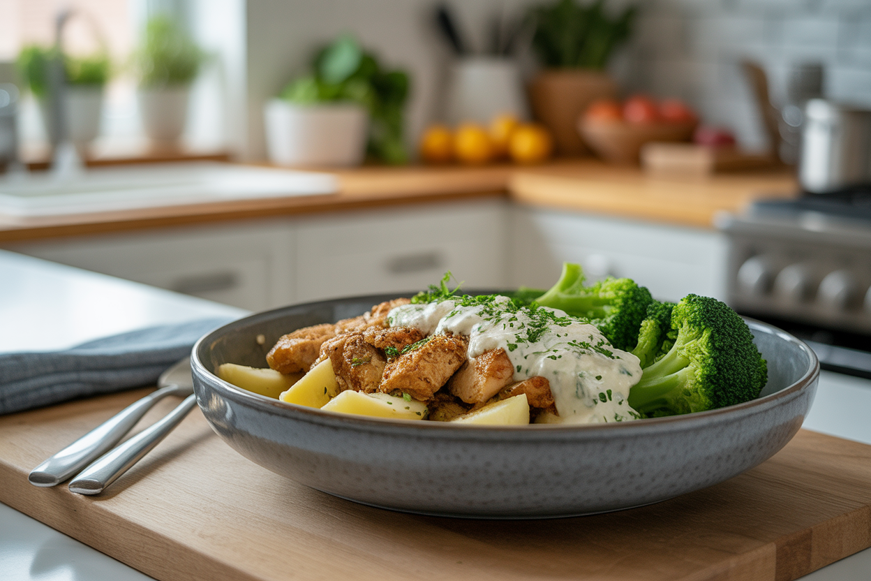Boil or roast the baby potatoes until tender. Blend the cottage cheese with Dijon, garlic powder, salt, pepper, and a small splash of milk if needed until smooth. Warm the chicken and broccoli, then build the bowl with potatoes, chicken, and broccoli. Spoon the creamy cottage cheese sauce over the top and finish with chives or parsley.