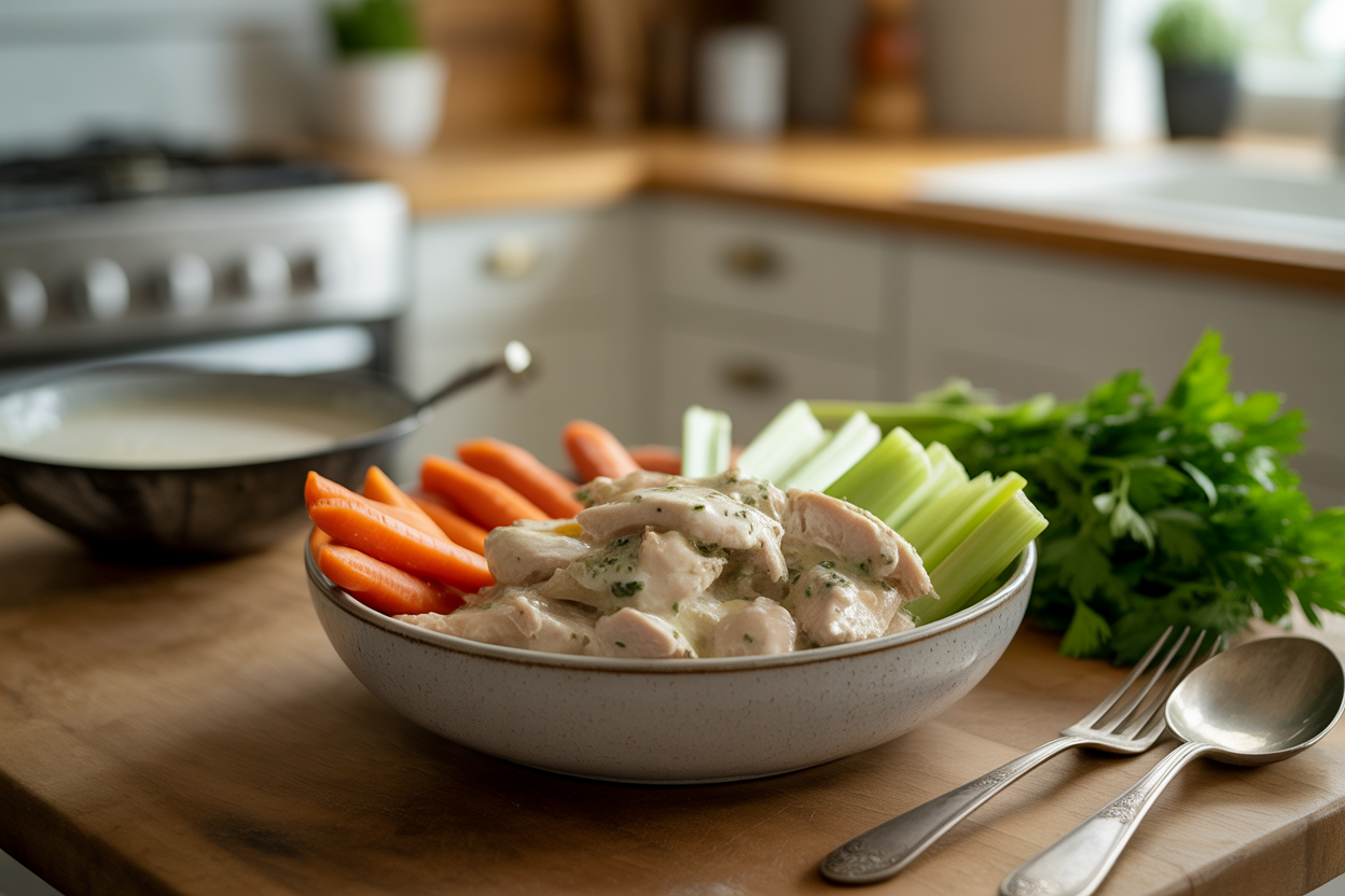 Cook the chicken, carrots, celery, onion, garlic, ranch seasoning, and a splash of broth in a slow cooker or large pot until the chicken is tender. Shred the chicken, then blend the cottage cheese until smooth and stir it in at the end to make the sauce creamy. Serve it as-is, or over rice or potatoes if your family wants a little more staying power.