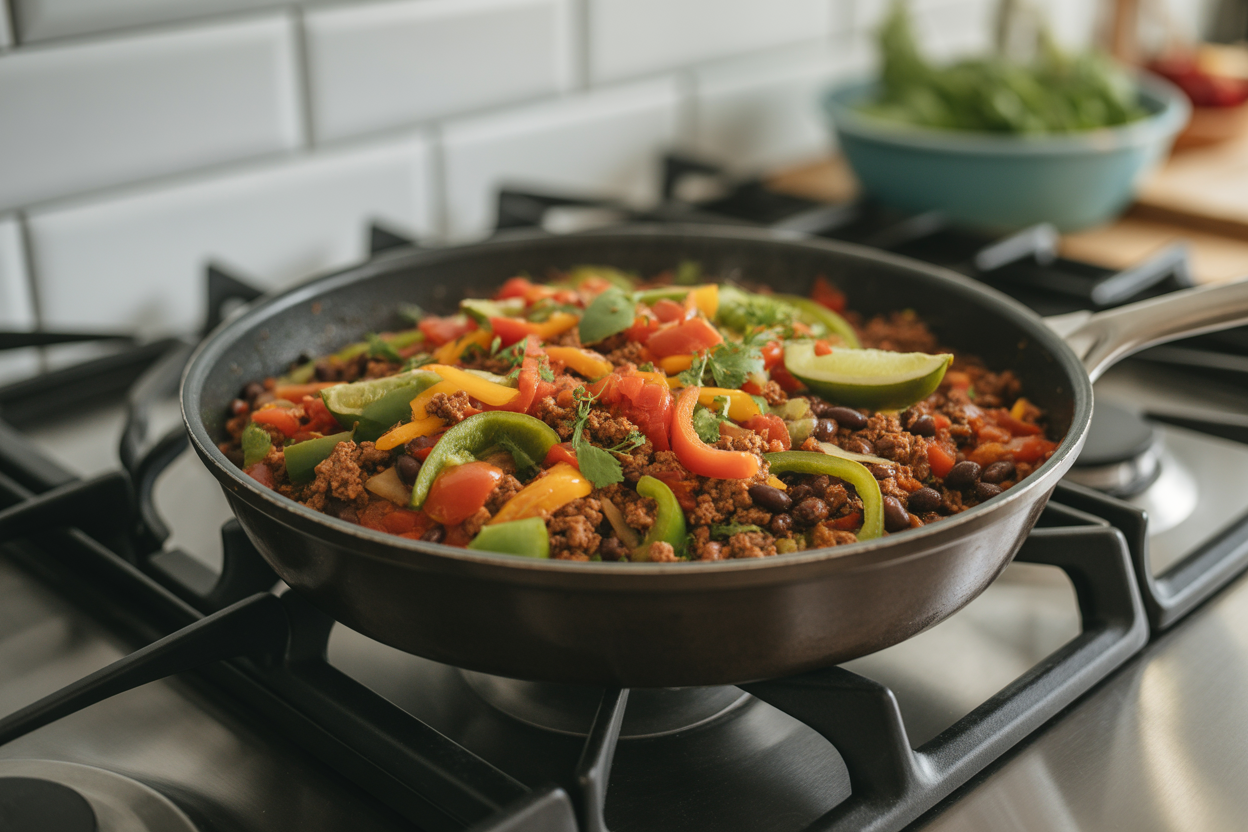 | Taco Skillet With Lean Beef and Beans | 10 min | 15 min | 30-40g | Uses protein and fiber to keep everyone fuller for longer |