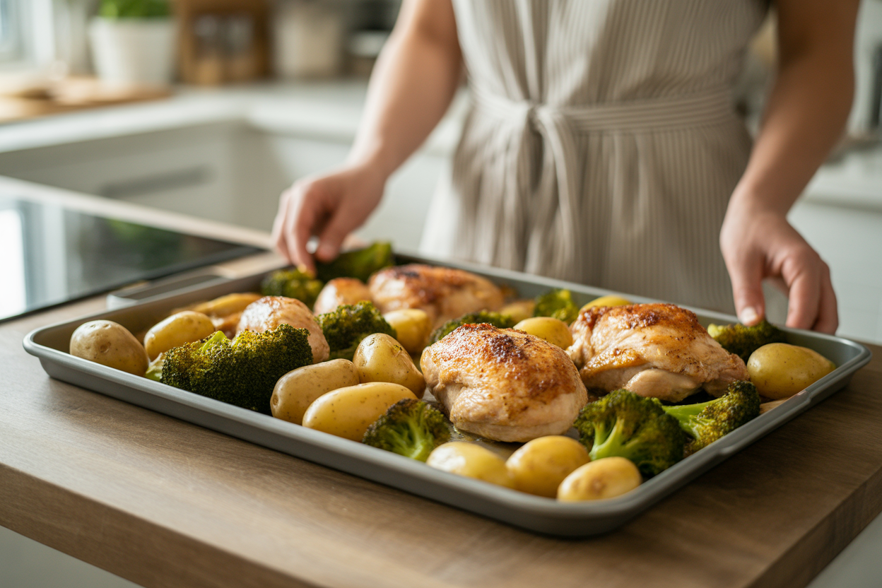 Toss the chicken, potatoes, and broccoli on a sheet pan with olive oil and seasoning. Roast until the chicken is cooked through, the potatoes are tender, and the broccoli is slightly crisp on the edges.