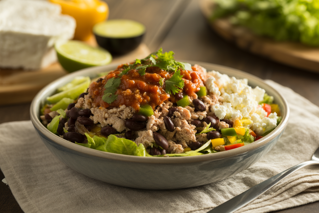 Why It Works: This meal combines protein, fiber, and volume, which is a strong setup for appetite control. Cottage cheese adds more protein with very little effort, beans help slow digestion, and the whole thing tends to keep you fuller than the usual sad desk lunch. It’s one of those Balanced Meals that helps you stay out of the snack drawer all afternoon.