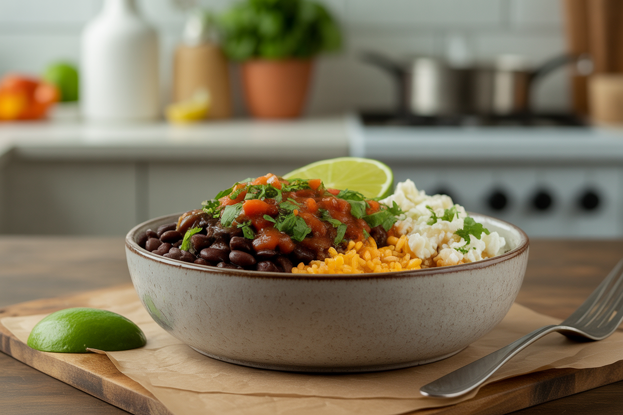 Heat the rice. Warm the black beans in a skillet or microwave with taco seasoning, salsa, and olive oil. Add the rice to a bowl, top with the bean mixture, then finish with cottage cheese, hot sauce, and a little corn or crushed tortilla chips if you want more texture.