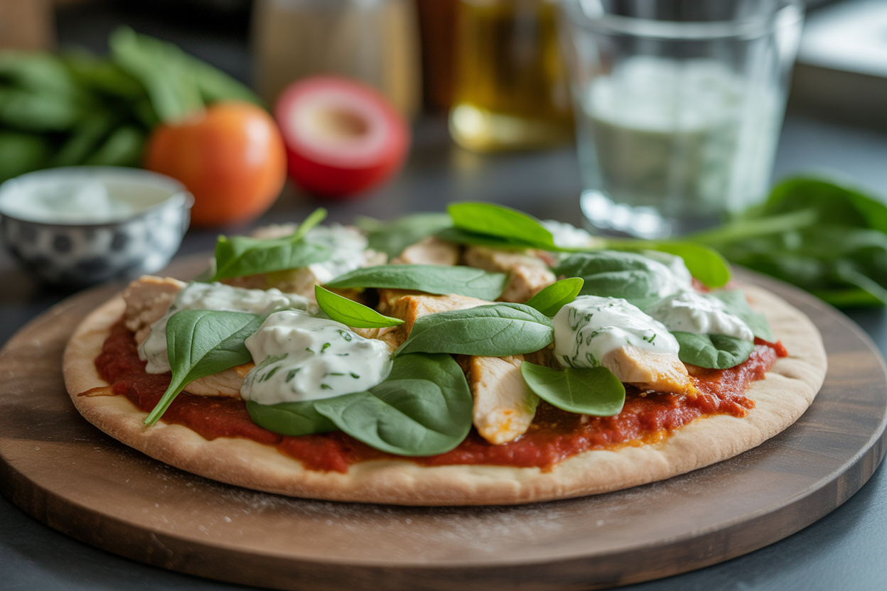 Start with a high-protein or whole grain flatbread. Spread on marinara, add shredded rotisserie chicken, mozzarella, spinach, and a few spoonfuls of Greek yogurt mixed with garlic and Italian seasoning if you want a creamy sauce layer. Bake or air fry until crisp.