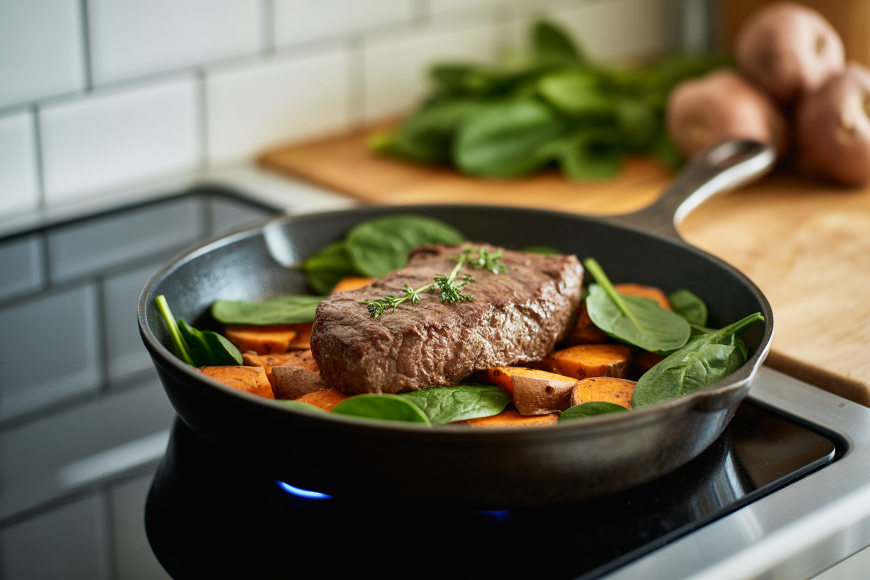 | Steak and Sweet Potato Skillet | 8 min | 10-12 min | 30-40g | Supports recovery and creates a more satisfying balanced dinner |