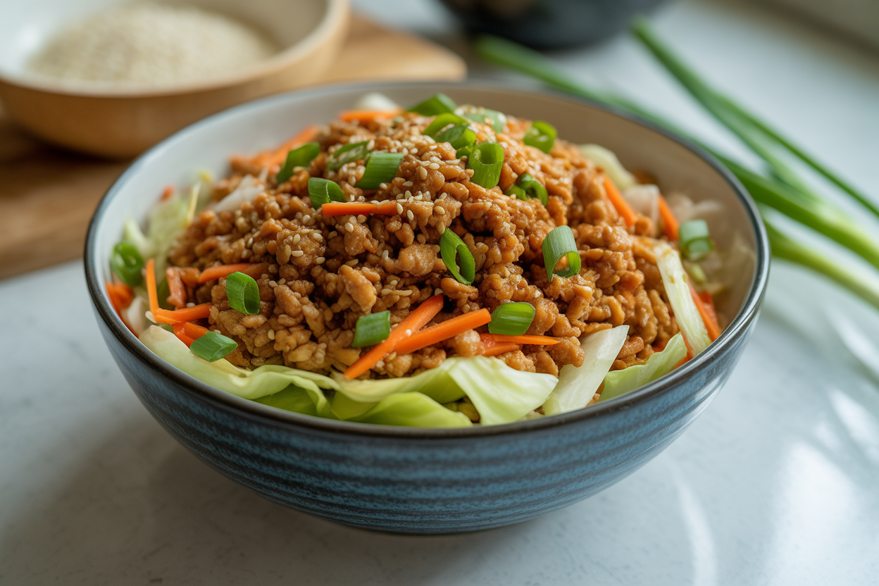 Cook ground chicken or turkey in a large skillet with garlic, ginger, and sesame oil. Add a bag of coleslaw mix or shredded cabbage, then cook until softened. Top with green onions, sesame seeds, and sriracha if you want a little heat.