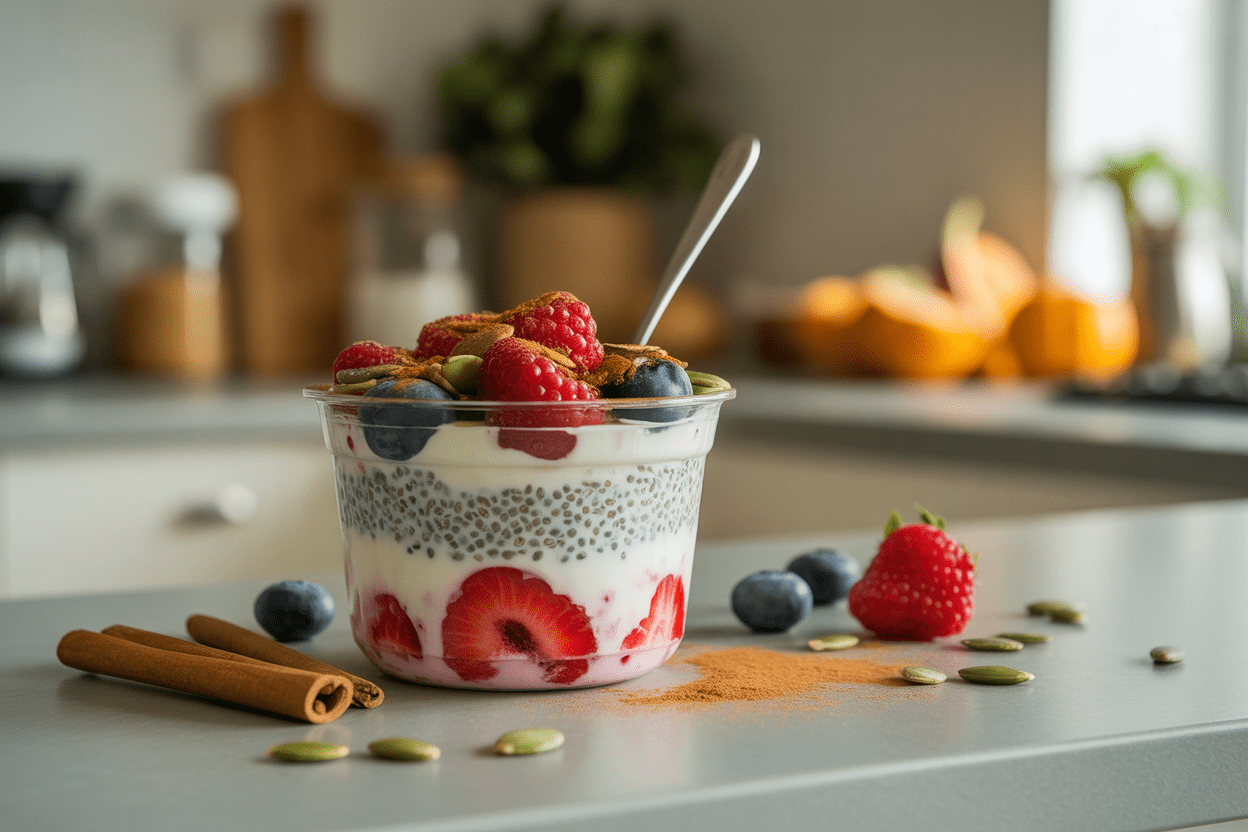 Add the Greek yogurt to a bowl or container, then top with berries, chia seeds, pumpkin seeds or walnuts, and a little cinnamon. If your afternoons get hectic, prep it ahead so it's ready when you need it.