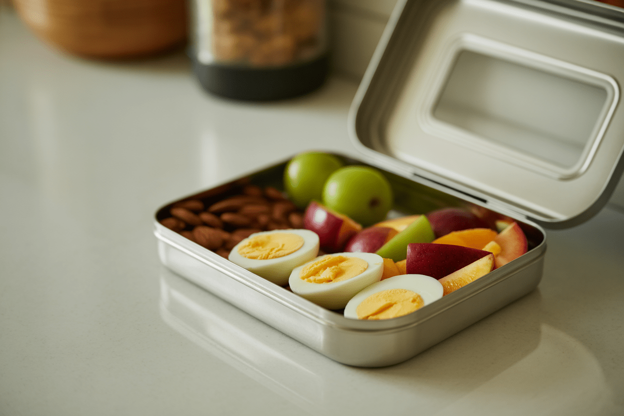 Why It Works: Eggs provide high-quality protein and healthy fats that support fullness and muscle retention. The fruit gives you a steadier carb source than most packaged snacks, and the nuts help extend that energy even more. The body is one big system, so when your snack is built better, your mood, focus, and evening food choices usually improve too. This is one of those healthy meal prep ideas that looks simple, but creates results that last.