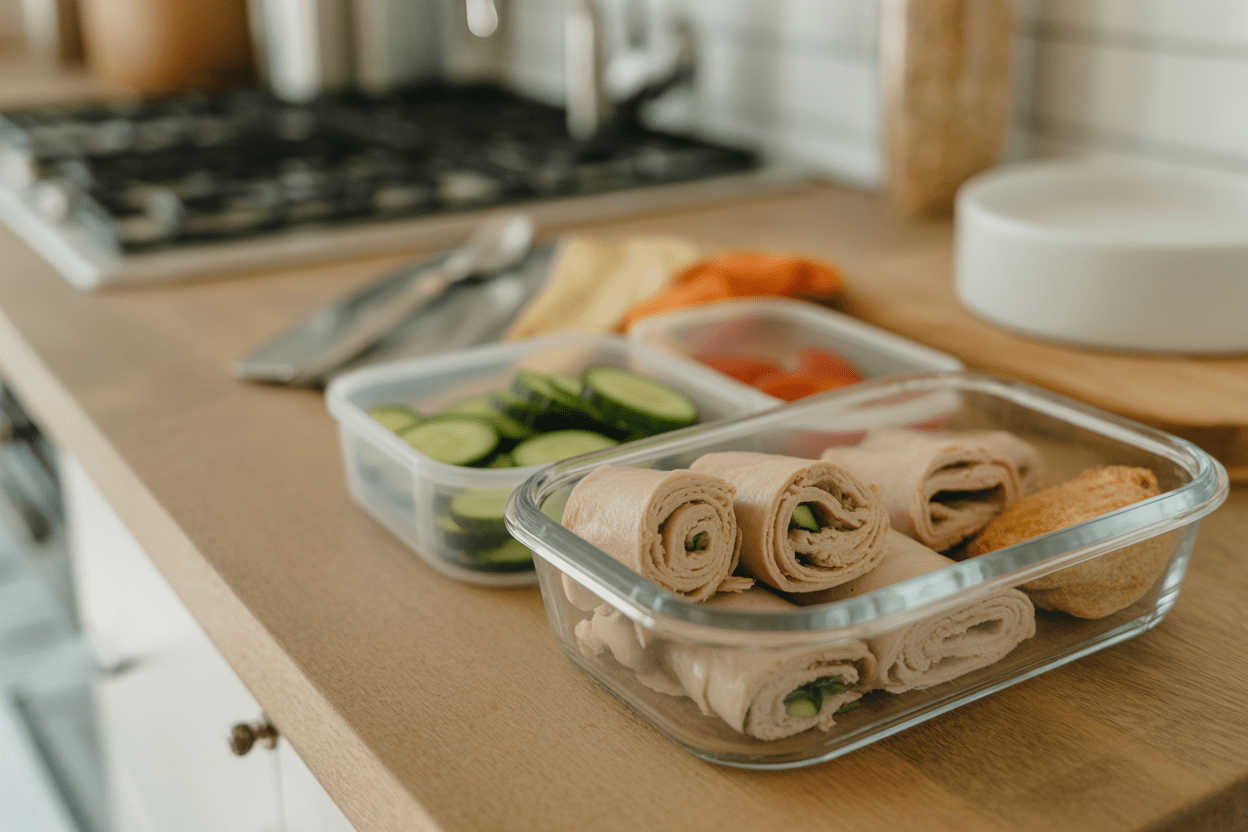 Why It Works: Turkey gives you lean protein that helps take the edge off hunger fast. Hummus and crunchy vegetables add fiber and volume, which makes the snack feel more complete. The research is clear that protein and blood sugar stability go hand in hand when compared with snacks built around processed carbs alone. For busy parents, that usually means better patience, fewer cravings, and less of that late-afternoon crash.