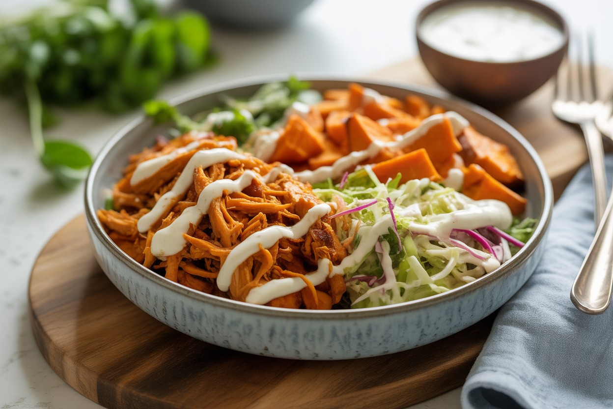 Roast or air fry cubed sweet potatoes. Warm up shredded chicken breast or thighs with a lower-sugar BBQ sauce. Then build your bowl with the chicken, sweet potatoes, coleslaw or broccoli slaw, and a drizzle of Greek yogurt ranch if you want. You can add avocado or green onions on top too.