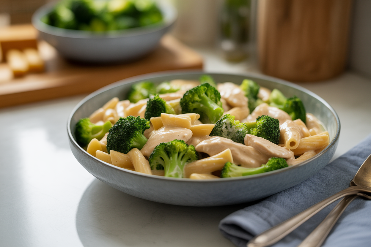 Cook chicken breast or chicken thighs in a pan with olive oil, garlic, salt, and pepper. Add broccoli and a little pasta water, then stir in a quick sauce made from blended cottage cheese, parmesan, and seasonings. Toss with protein pasta, regular pasta, or a mix of pasta and extra broccoli.