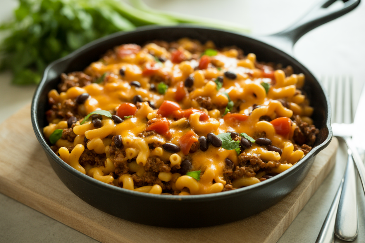 Brown lean ground beef with taco seasoning, onion, and garlic. Stir in cooked pasta, black beans, diced tomatoes, and a cheese sauce made from shredded cheddar plus a little Greek yogurt or blended cottage cheese. Top with cilantro, avocado, or green onions if you want.