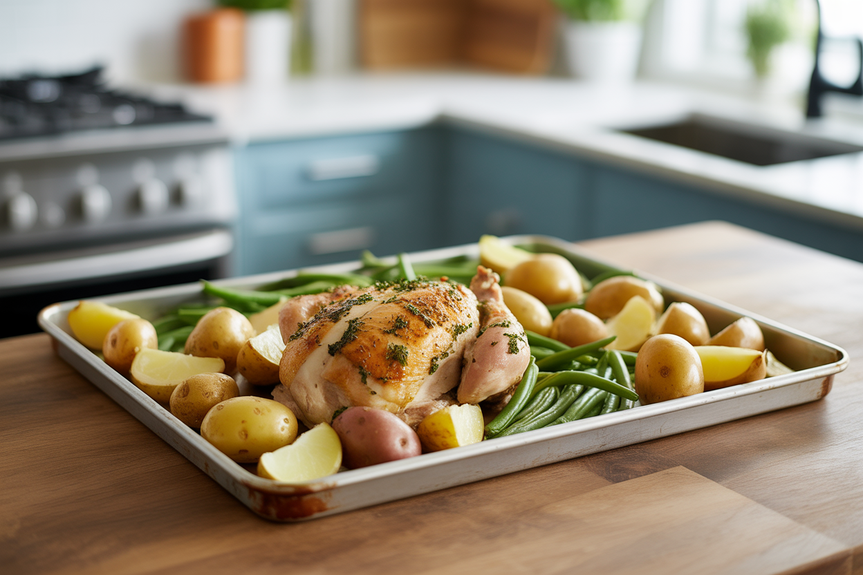 Add chicken thighs or chicken breast, baby potatoes, and green beans to a sheet pan. Drizzle with olive oil, then season with garlic, salt, pepper, and paprika. Roast until the chicken is cooked through and the potatoes are tender. You can swap in broccoli, Brussels sprouts, or carrots depending on what you have.