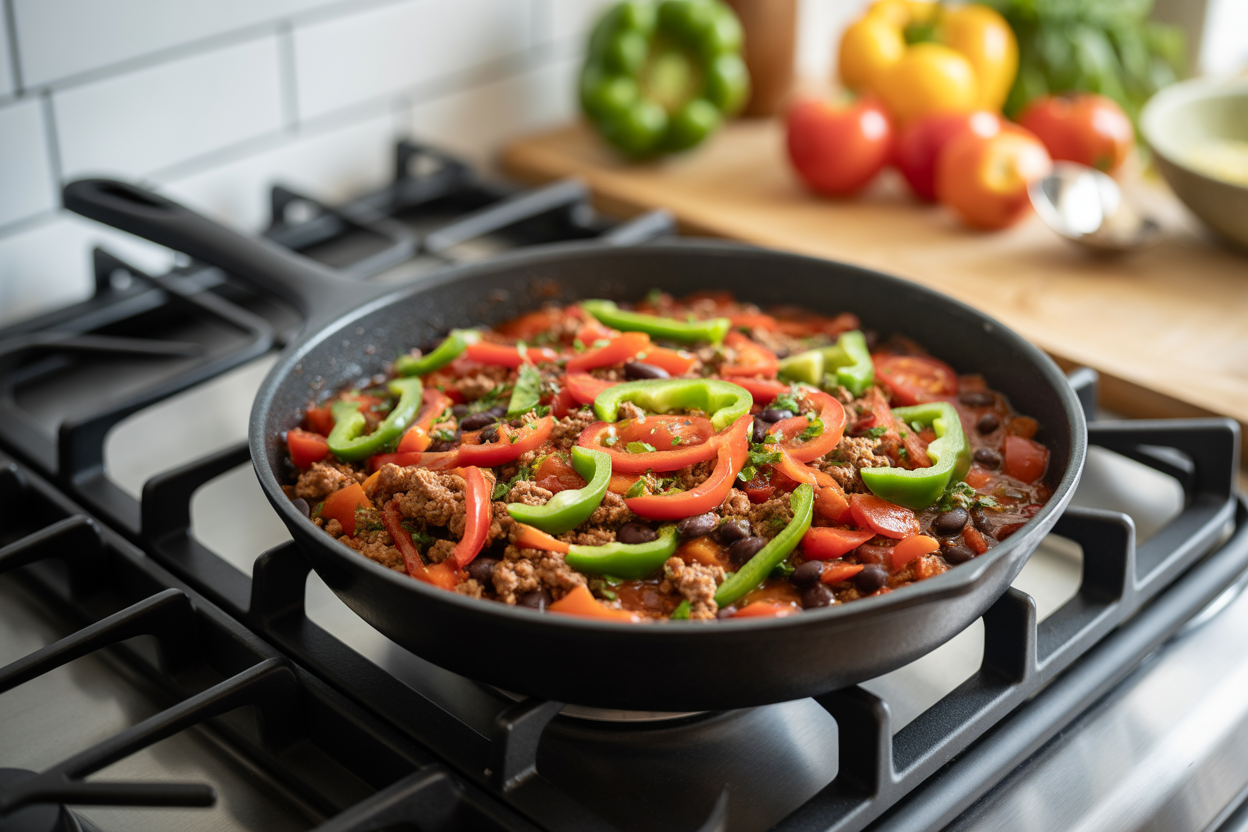Brown lean ground beef, then add onions, peppers, taco seasoning, black beans, and diced tomatoes. Let it all cook together in 1 pan. Serve it over rice, in lettuce cups, or as a taco bowl with salsa, avocado, and Greek yogurt.