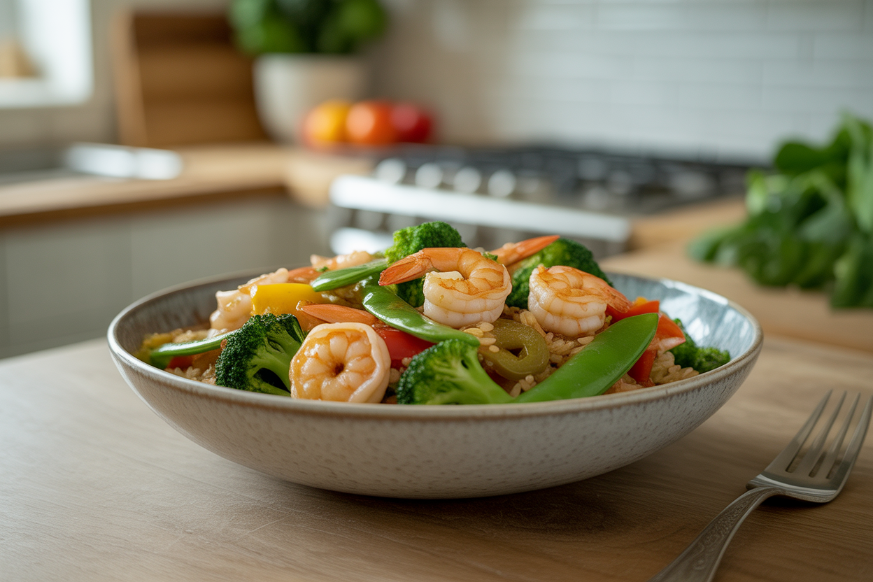 Why It Works: Shrimp is a lean protein source that helps you feel satisfied without making the meal overly heavy. The vegetables add fiber, micronutrients, and volume, which all help with fullness. Pairing protein with rice and fiber-rich vegetables gives you a steadier release of energy than a takeout-style carb-heavy meal, so you’re less likely to crash and circle back to the pantry later.