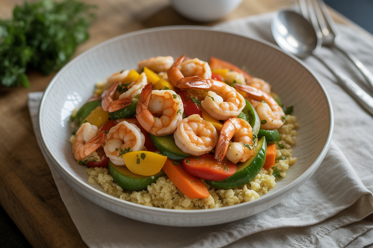 This is one of those high protein recipes dinner options that works because it removes friction. Shrimp cook fast, frozen vegetables save time, and the whole meal comes together in about 15 minutes.