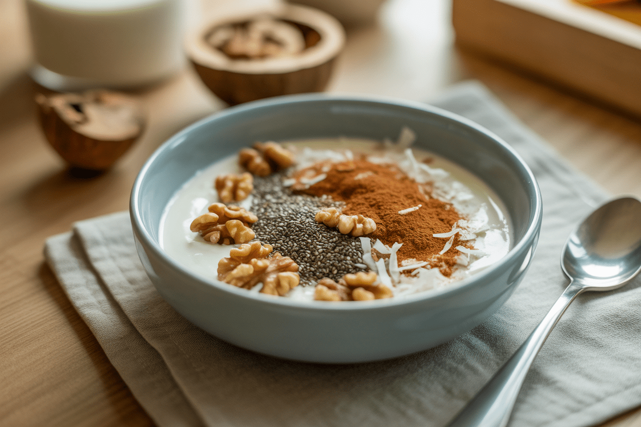 Why It Works: Greek yogurt gives you a strong protein base, and the nuts and seeds add texture plus a little extra staying power. This helps make healthy high protein meals easier to sustain on busy mornings. It also works well for easy healthy meal prep if you build a few bowls ahead.