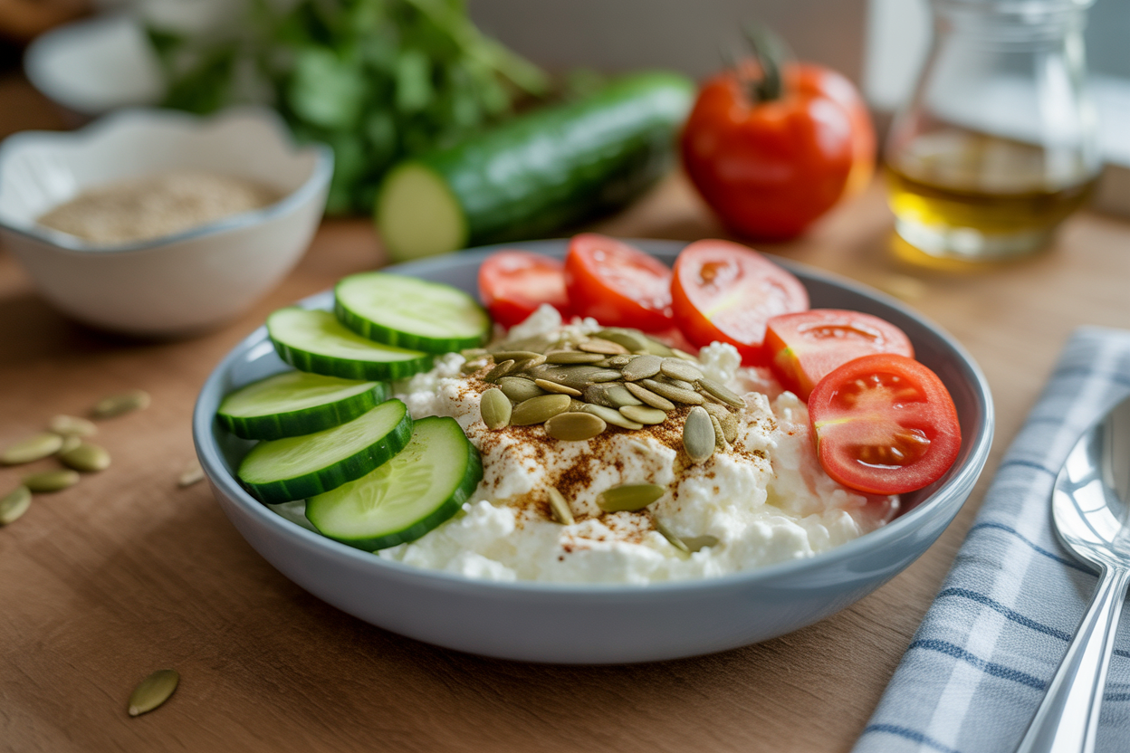 Add the cottage cheese to a bowl, top it with cucumber, tomatoes, pumpkin seeds, and everything seasoning, then eat it right away. Keep the structure simple so it stays low-friction.