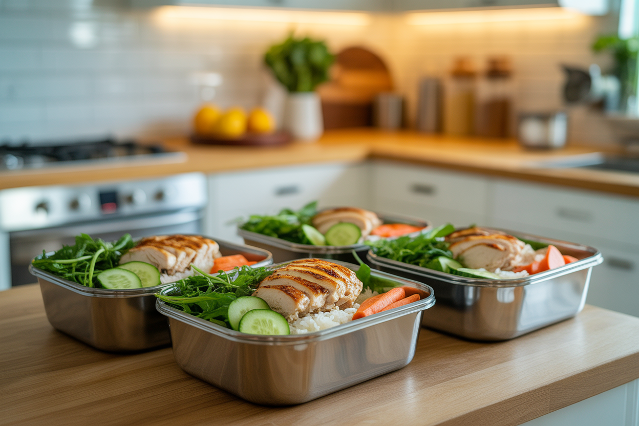 Grab a rotisserie chicken, microwaveable rice or quinoa, and pre-washed greens. Build a bowl with chicken, grains, greens, chopped cucumbers, shredded carrots, olive oil, lemon juice, and a little feta or hummus. You can prep 3 containers at once in under 15 minutes.