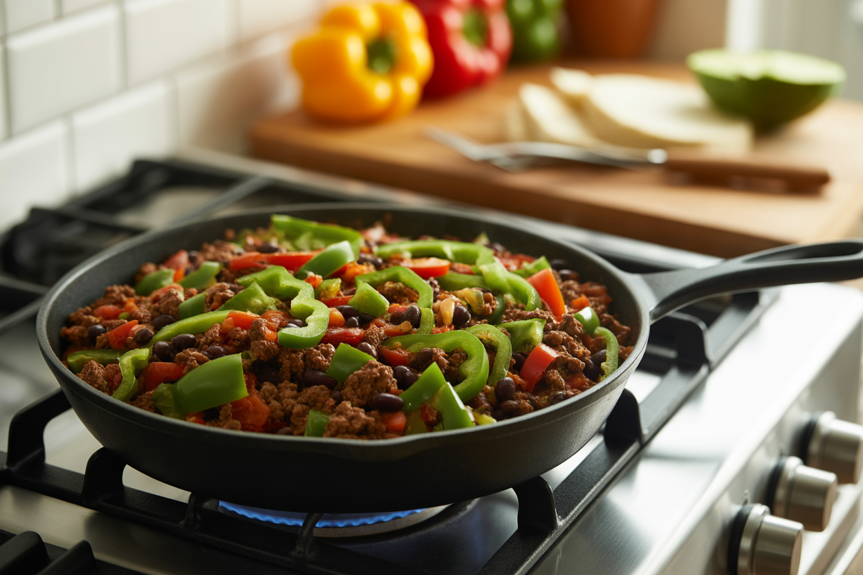 Most parents need dinners that are fast, flexible, and hard to mess up. This one checks every box. Brown lean ground beef or turkey, add taco seasoning, black beans, diced tomatoes, onions, and peppers, then let it all cook together in one pan. Serve over rice, in lettuce cups, or with avocado and salsa.