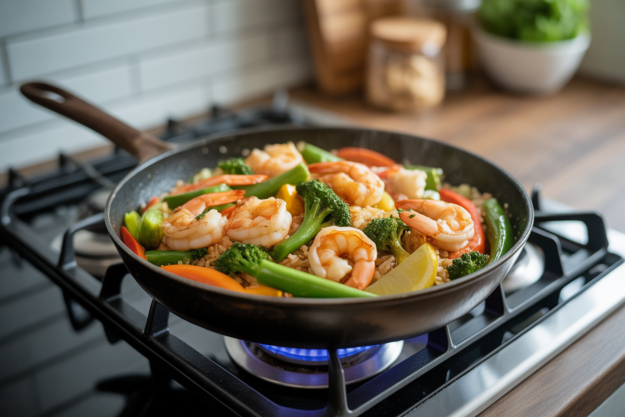 | Garlic Shrimp Stir-Fry With Rice | 5 min | 8-10 min | 30-40g | Fast, lean protein dinner with very little cleanup |