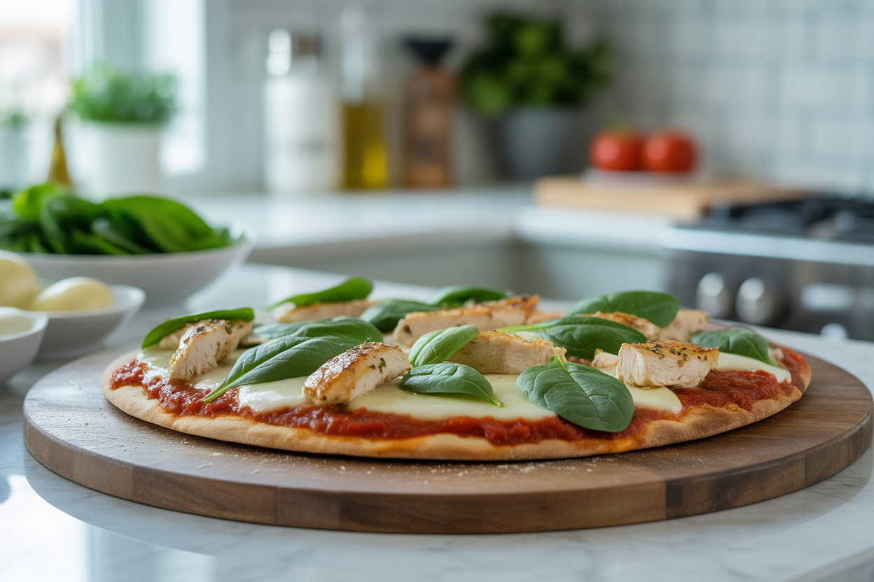Mix the Greek yogurt with garlic powder and Italian seasoning. Spread a thin layer on the flatbreads, then add marinara, chicken, mozzarella, and spinach. Bake at 425°F for 10-12 minutes until crisp and melted.
