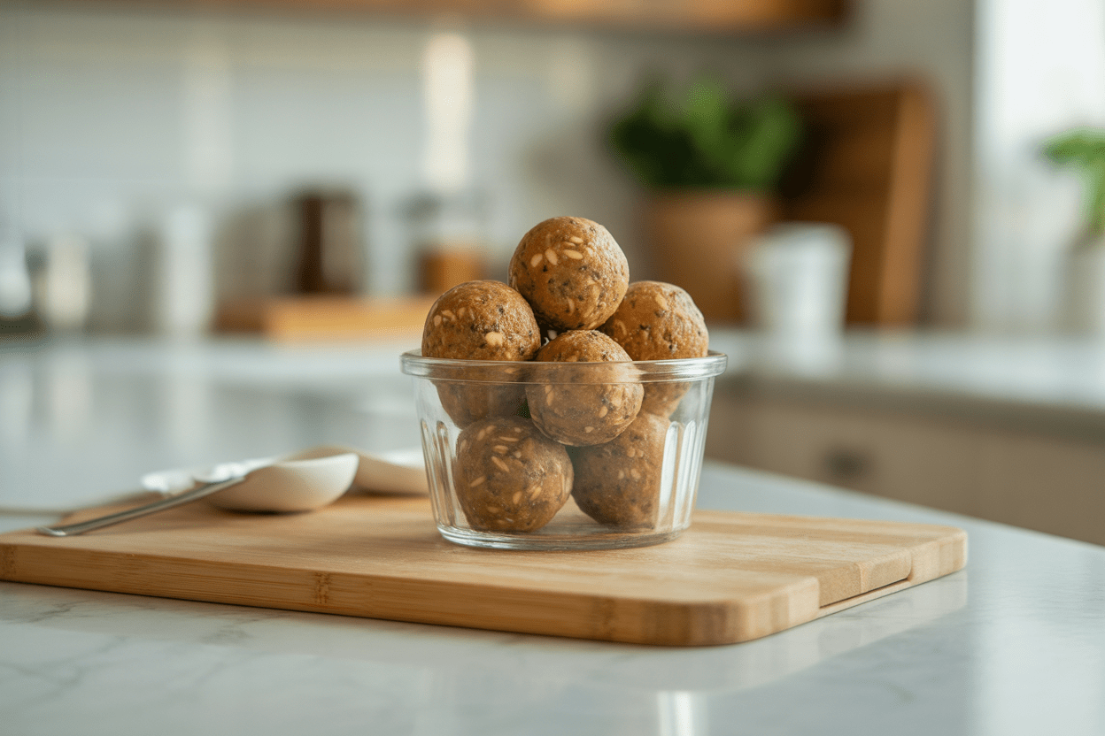 Mix everything together, roll into small balls, then chill until firm. Keep a batch in the fridge so you can grab two or three on your way out.