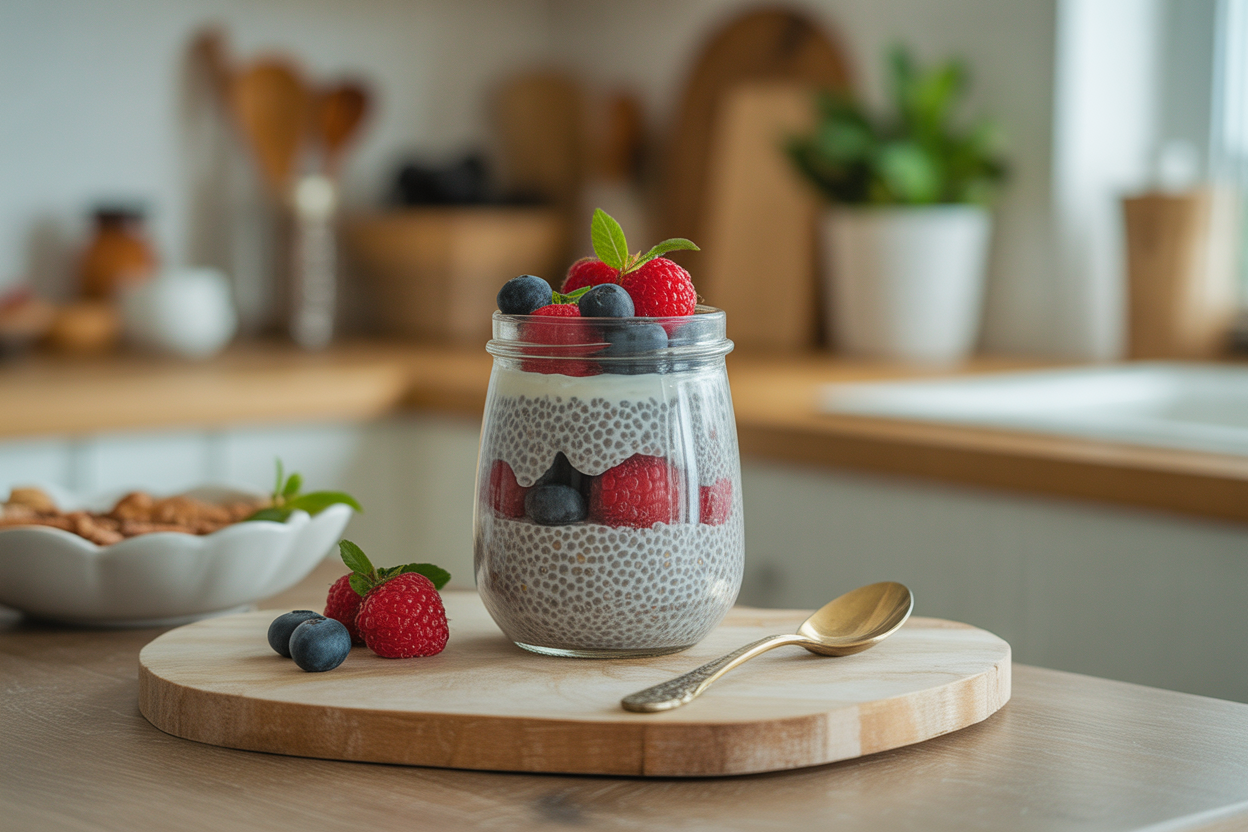 Why It Works: Chia absorbs liquid and creates a thicker texture that slows the meal down. Combined with Greek yogurt and protein powder, you get protein, fiber, and a little fat in one container. That tends to improve satiety and help reduce the snack-chasing that often happens mid-morning.