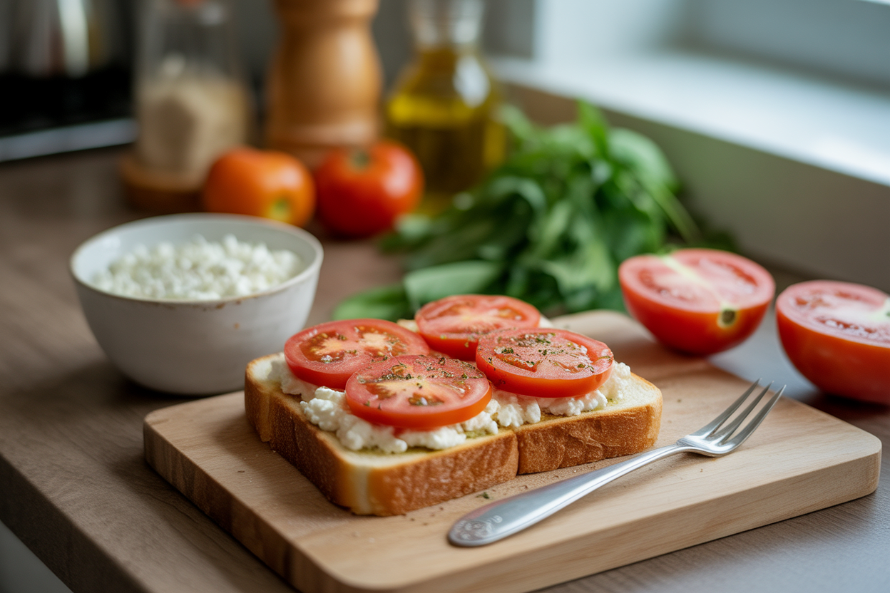 Toast the bread, spoon the cottage cheese on top, then add tomatoes and seasoning. Serve it right away while the toast still has some crunch.