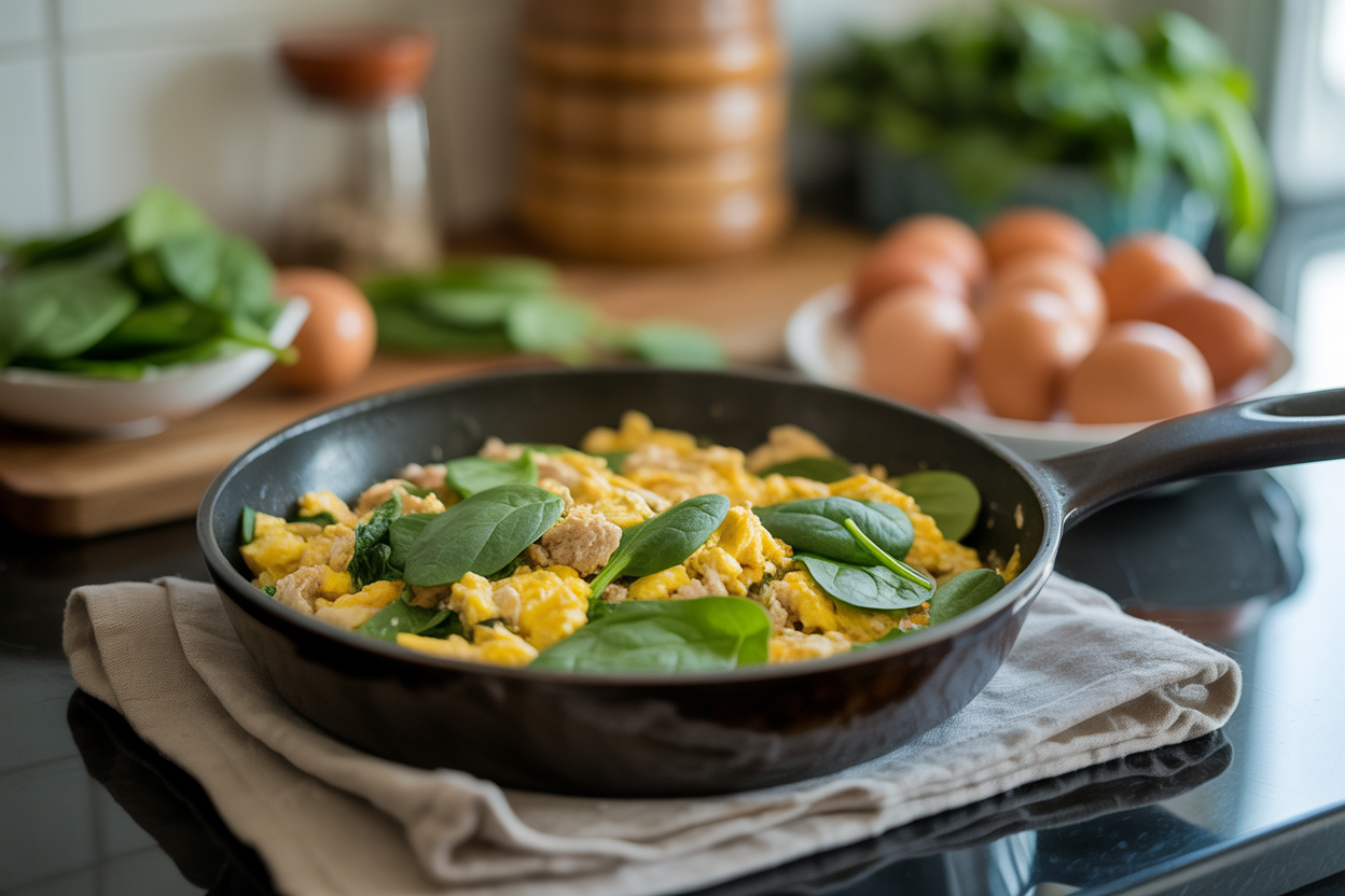 Cook the turkey and spinach briefly, then add the eggs and egg whites and scramble until cooked through. Serve hot right away.