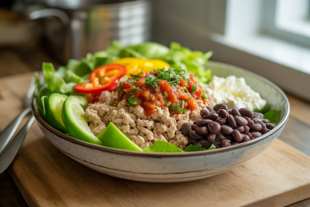 Cook the ground turkey or beef with taco seasoning until browned. Add it to a bowl with black beans, salsa, lettuce, peppers, and a scoop of cottage cheese. Serve it over rice or cauliflower rice, then add avocado if you want a little more staying power.