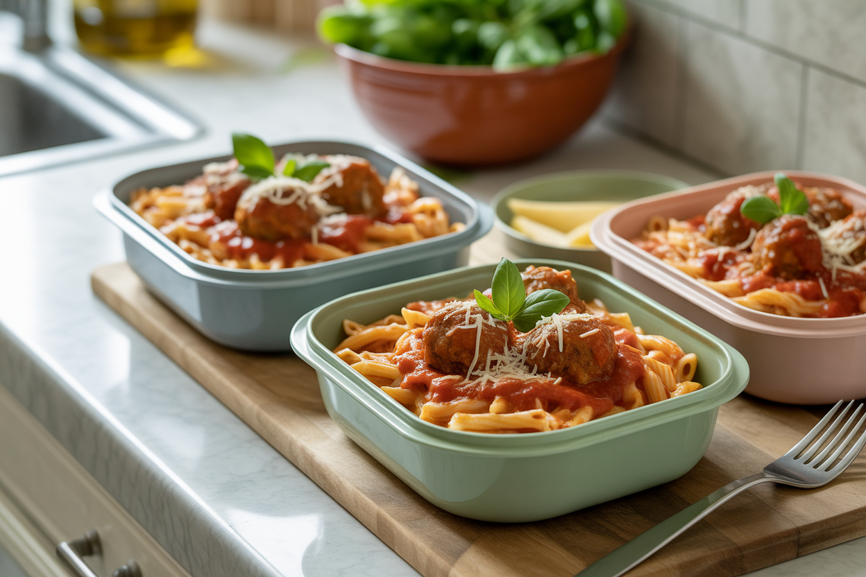 Cook the meatballs and pasta, then portion them into containers with marinara, spinach, and parmesan. Reheat until hot and stir before eating.