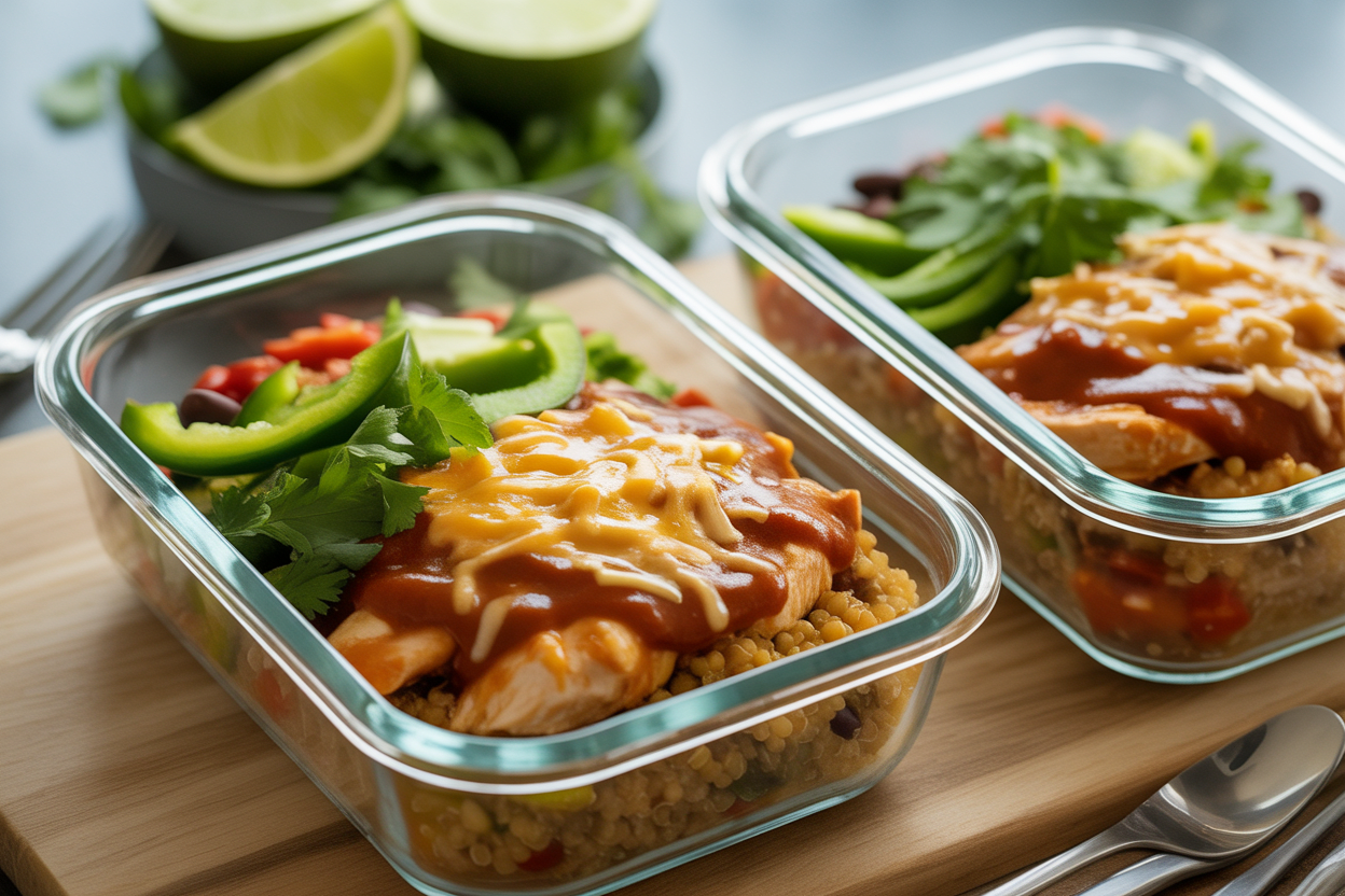 Build the bowls with quinoa, chicken, beans, peppers, enchilada sauce, and cheese, then store in containers until needed. Reheat until hot and mix before eating.