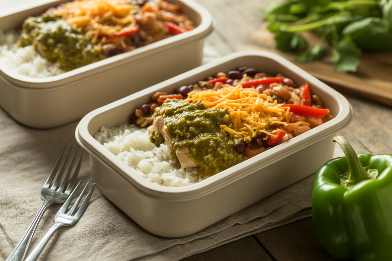 Layer everything into meal prep bowls and refrigerate until needed. Reheat and stir the salsa verde through the bowl before serving.