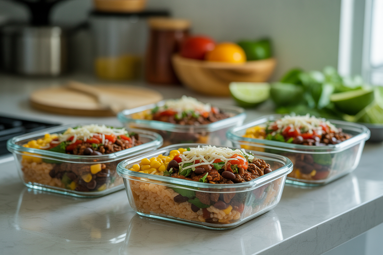Cook the beef with taco seasoning, then build the bowls with rice, beans, corn, salsa, and cheese. Reheat before eating and keep the toppings simple.