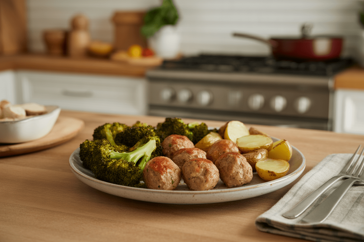 | Turkey Meatballs With Roasted Potatoes and Broccoli | 15 min | 25-30 min | 30-35g | Reheats cleanly and creates a balanced family meal |