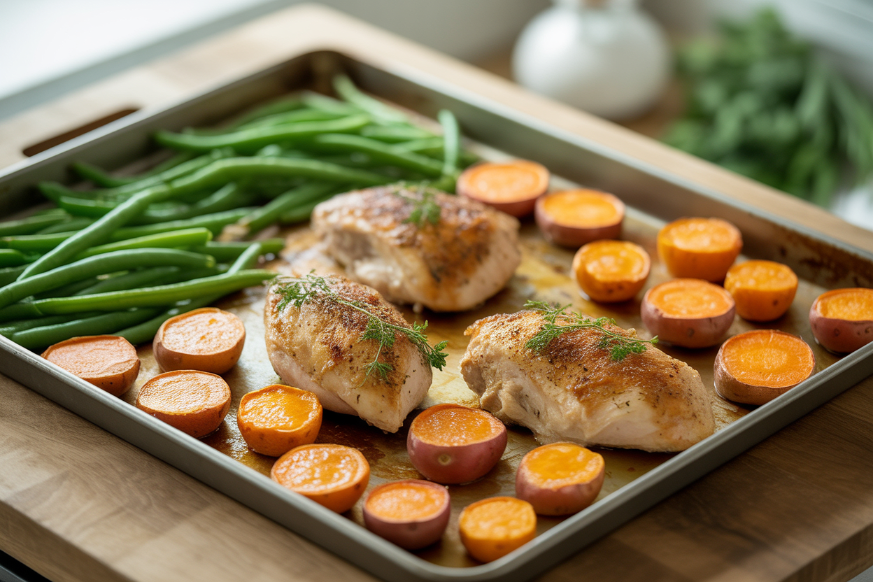 | Sheet Pan Chicken, Sweet Potatoes, and Green Beans | 10 min | 25-30 min | 30-35g | Simple all-in-one meal with solid leftover texture |