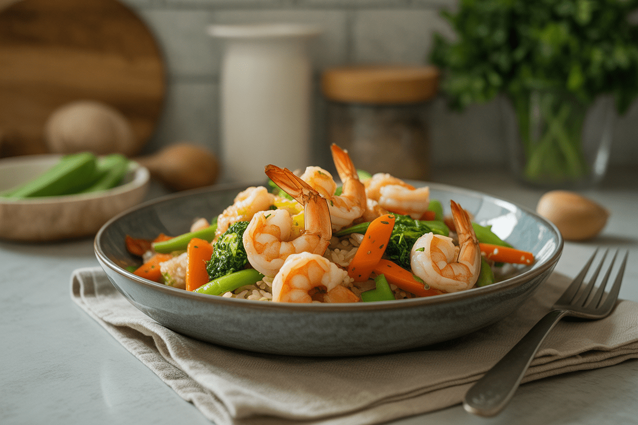 Why It Works: Shrimp is a lean protein source that cooks in minutes, which makes it perfect for busy parents. The vegetables add fiber, volume, and micronutrients, and rice gives you an easy carb source without overcomplicating the meal. This is one of those healthy high protein meals that helps you eat well even when time is tight.