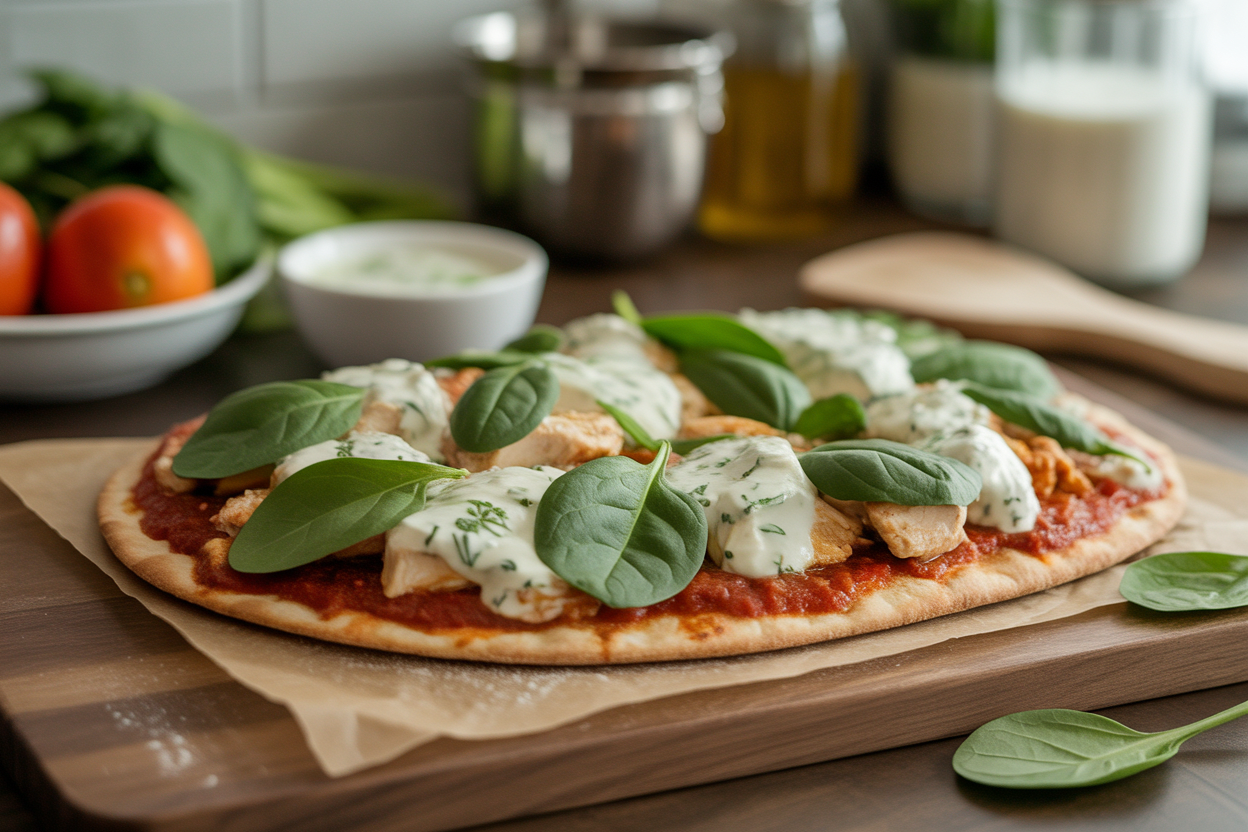 Spread marinara over the flatbread. Add shredded chicken, mozzarella, and spinach. Mix Greek yogurt with garlic powder and Italian seasoning, then add a few spoonfuls on top or underneath as a creamy layer. Bake or air fry until the flatbread is crisp and the cheese is melted.