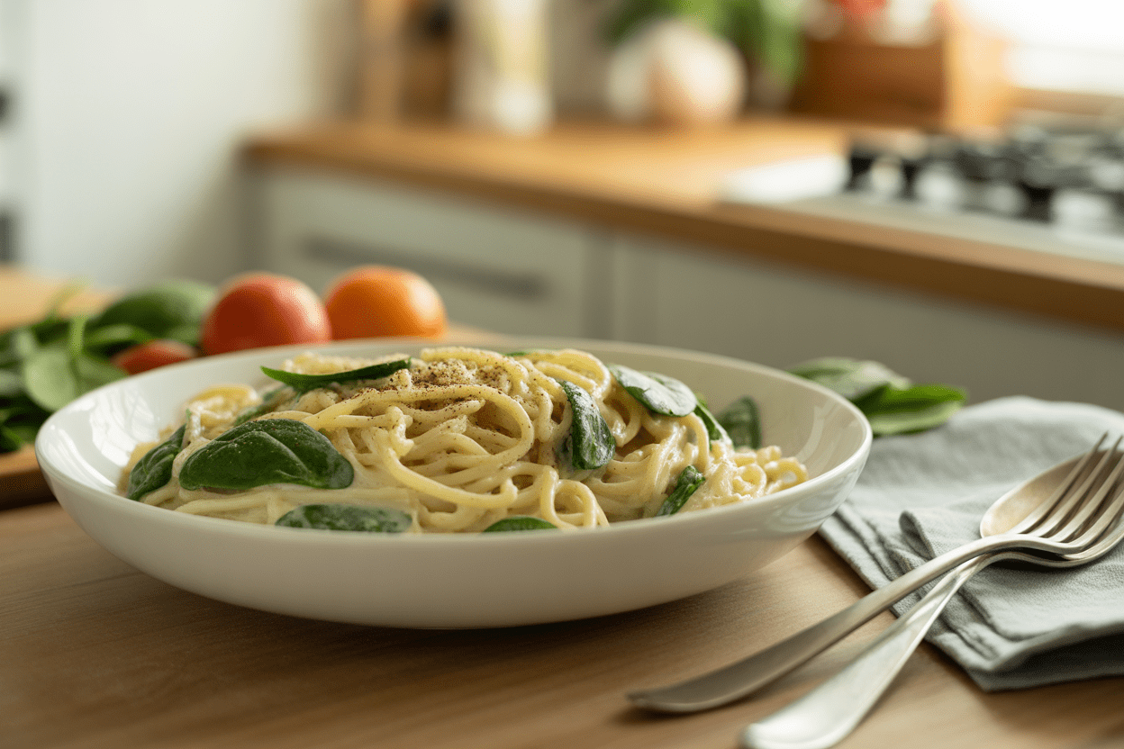 Blend the cottage cheese with parmesan, garlic, and a little pasta water, then toss it with cooked pasta and spinach until creamy. Add more pepper on top before serving.