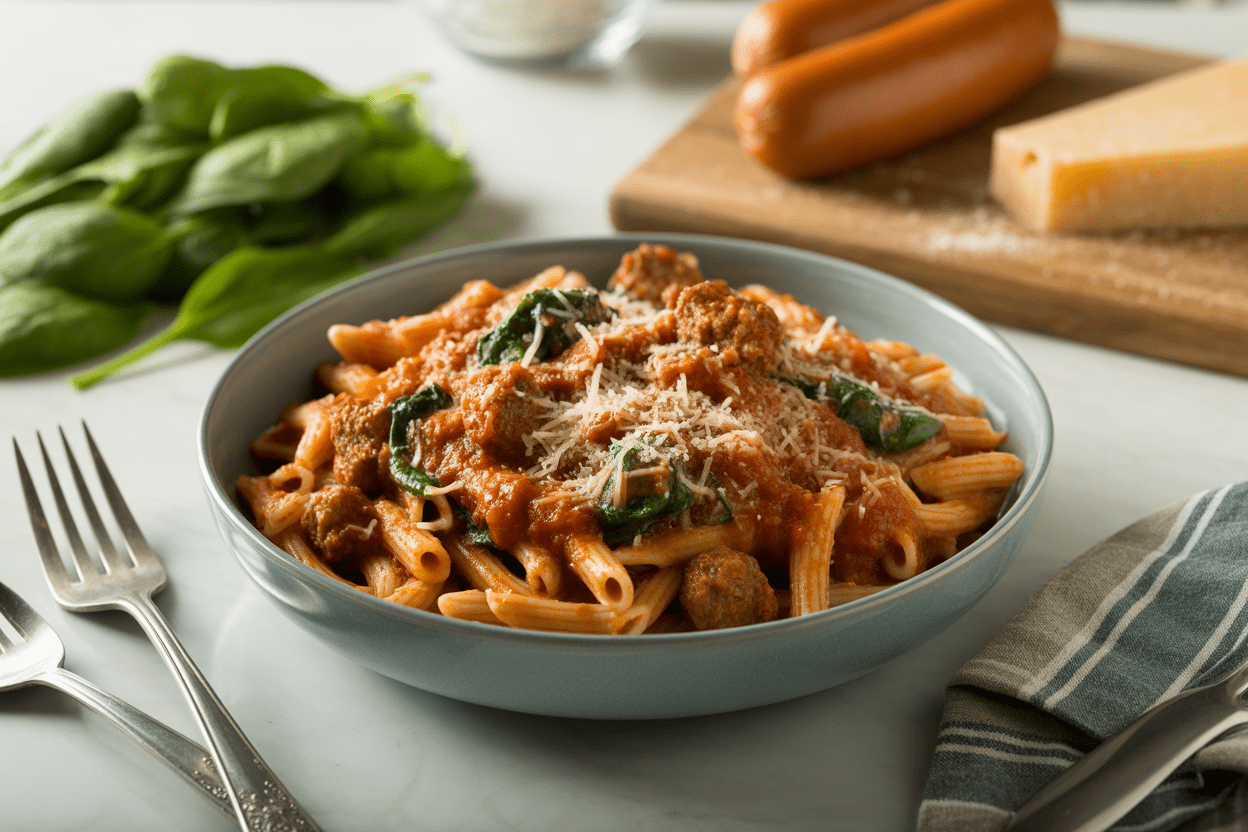 Cook the sausage and garlic in olive oil, add marinara and spinach, then toss in the cooked pasta and top with parmesan. Keep the ingredient list short so the meal stays low-friction.