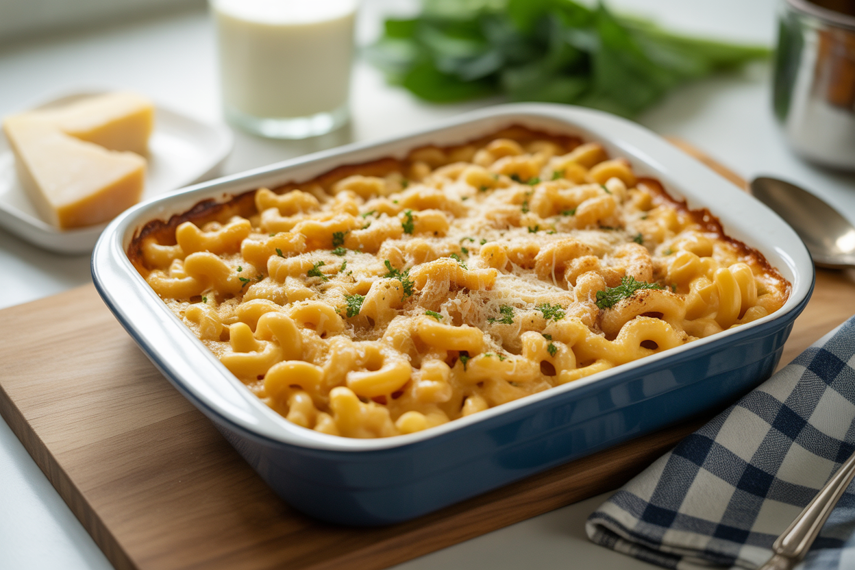 Mix the cooked pasta with Greek yogurt, cheese, milk, and seasonings, then bake until hot and creamy. Add a little more parmesan on top if you want more flavor.