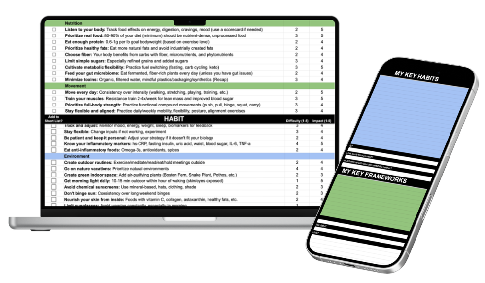 Every habit, protocol, and framework from the book, organized by system (nutrition, movement, sleep, stress, etc.), with difficulty and impact scores. Use it during the workshop to instantly pick the 2–3 habits that will move the needle most for your situation, without rereading all 28 chapters.